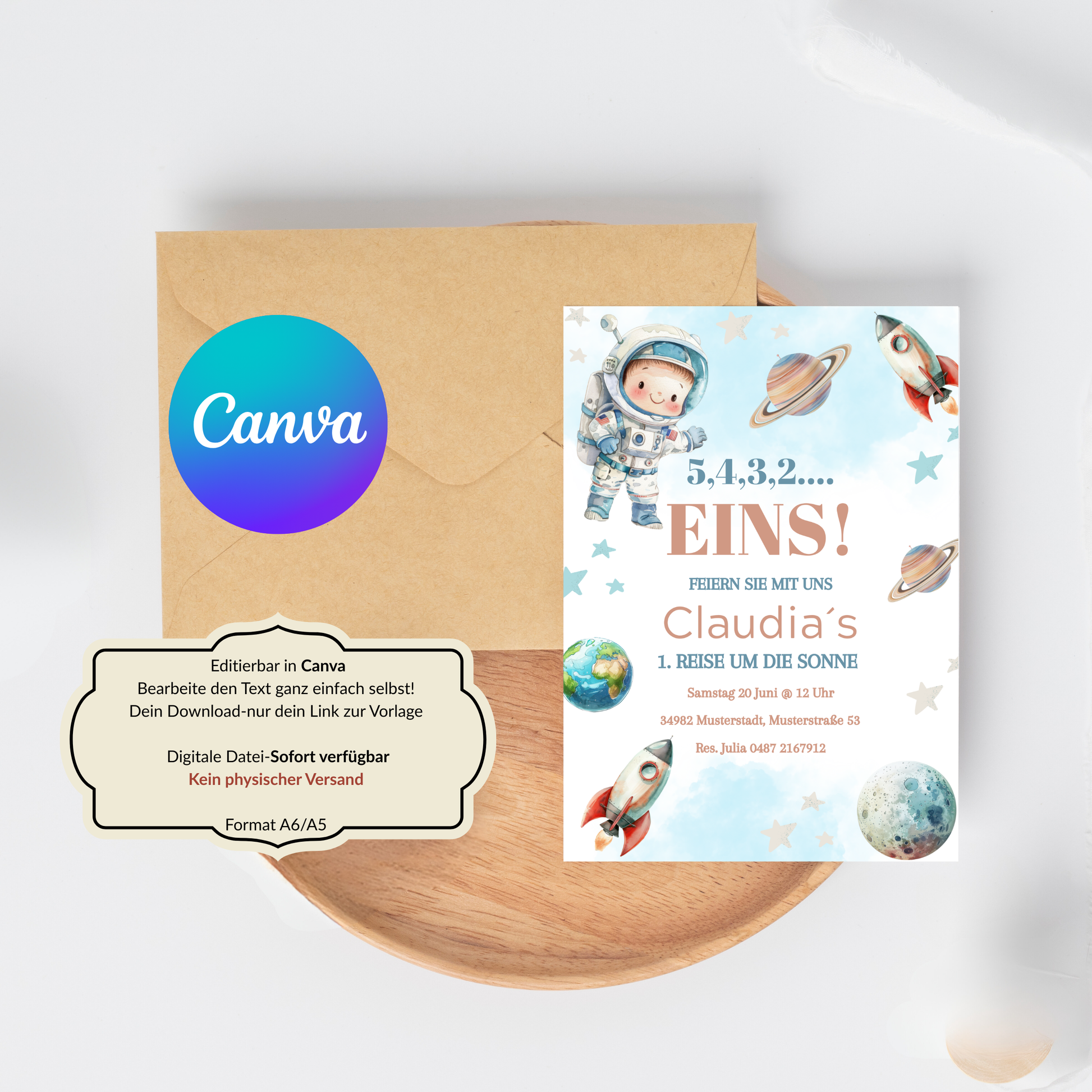 Eine galaktisch schöne Einladung für kleine Astronauten-Fans! 🚀✨ Dieses liebevoll gestaltete Design zeigt einen süßen Astronauten, Planeten, Sterne und eine Rakete in freundlichen Farben. Perfekt für einen unvergesslichen Kindergeburtstag im Weltraum-Stil. Dank des Canva-Links kannst du die Einladung schnell und unkompliziert anpassen – ideal für Mamas, die auf der Suche nach einer modernen und flexiblen Lösung sind.