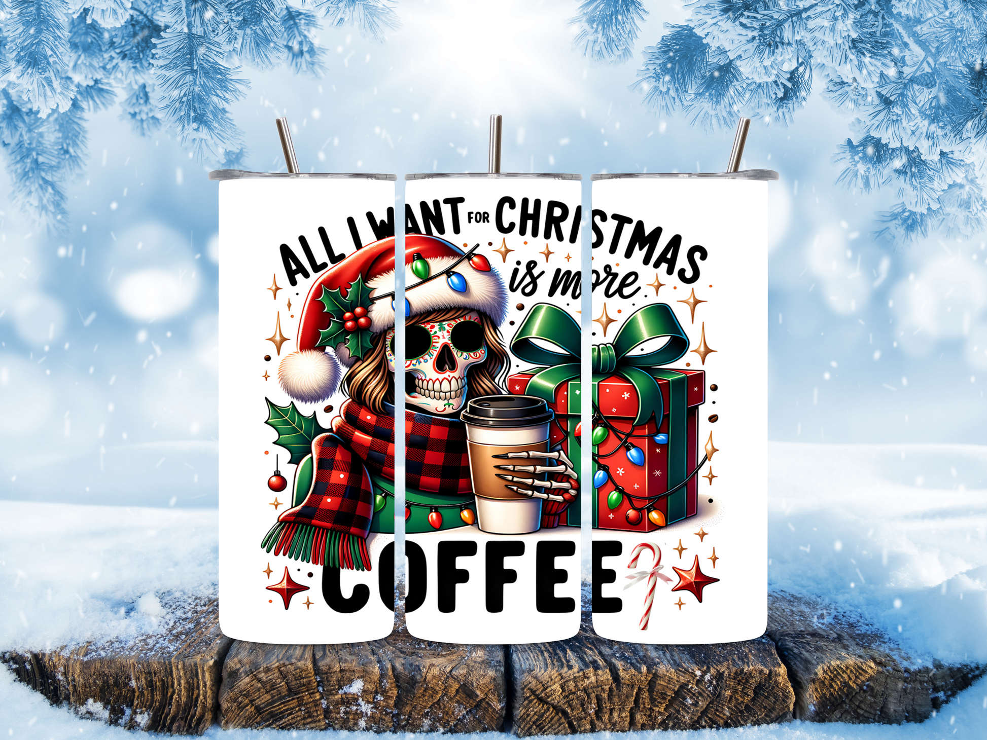 Lustiger Edelstahlbecher mit Skelett-Frau und Spruch: All I Want For Christmas Is More Coffee. Perfekt für Kaffee- und Weihnachtsfans!
